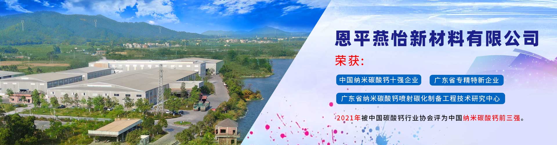 恩平燕怡新材料有限公司成立于2006年,位于廣東省江門恩平市。是一家專注于納米碳酸鈣產(chǎn)品研發(fā)、生產(chǎn)以及銷售服務(wù)的新材料企業(yè)。 公司榮獲 “高新技術(shù)企業(yè)”、 “清潔生產(chǎn)企業(yè)”、“廣東省納米碳酸鈣噴射碳化制備工程技術(shù)研究中心” 、 “中國(guó)納米碳酸鈣十強(qiáng)企業(yè)” 、 “廣東省專精特新企業(yè)”等稱號(hào),并通過(guò)ISO9001:2015質(zhì)量管理體系認(rèn)證,產(chǎn)品質(zhì)量符合國(guó)家行業(yè)標(biāo)準(zhǔn)GB/T19590—2011納米碳酸鈣優(yōu)等品的要求。...